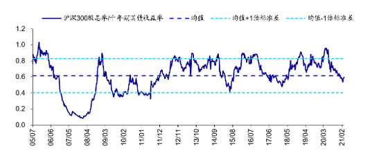 2005年以来沪深300股息率/十年期国债收益率高点为1.03,低点为0.08,最新一周沪深300股息率/十年期国债收益率为0.60,处在历史上从高到低60%的分位,较前一周的0.59上升。