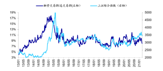 2013年以来融资交易占比高点为18%,低点为4%,最新一周融资交易占比8.04%,处在历史上由低到高26%的分位,较前一周的8.48%下降。