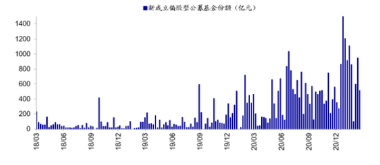 最近一周偏股型基金新发行增加513亿元,21年累计发行8608亿元。