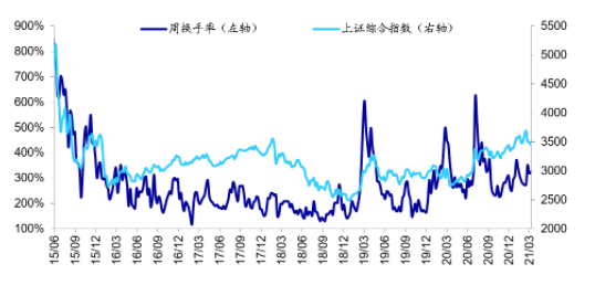 2005年以来周换手率(年化)高点、低点分别为1719%、87%、均值为354%,最新一周为323%,处在历史上由低到高65%的分位,较前一周的318%上升。