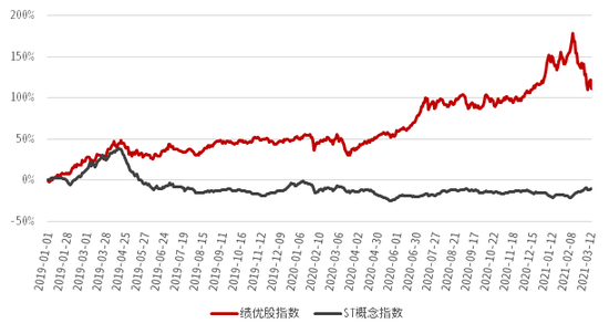 我们提取了2019年以来绩优股指数、ST股指数的走势,可以发现:绩优股指数累计涨幅111.55%,同期ST股指数-10.64%,超额收益达122.19%。
