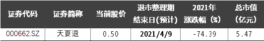 其中,天夏智慧已被交易所决定强制退市,退市整理期结束后公司股票将被摘牌,概况如下。