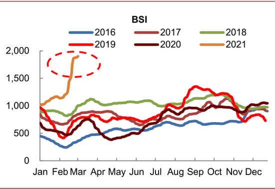首先集运板块我们继续看好,需求端,2月份八大港口集装箱吞吐量同比增长37%,较2019年2月增长9.9%,其中外贸箱同比增长37.9%,内贸箱同比增长34.7%。从更高频的数据来看,3月上旬港口集装箱吞吐量增速为14.5%,其中外贸箱同比增长13.8%,内贸箱同比增长16.7%,港口反馈就地过年使腹地企业复工更快,春节后箱量恢复早于往年。美国在财政刺激之下,补库存和消费应该继续对出口有一定的支撑,我们预计集运需求跟随出口继续保持强劲。