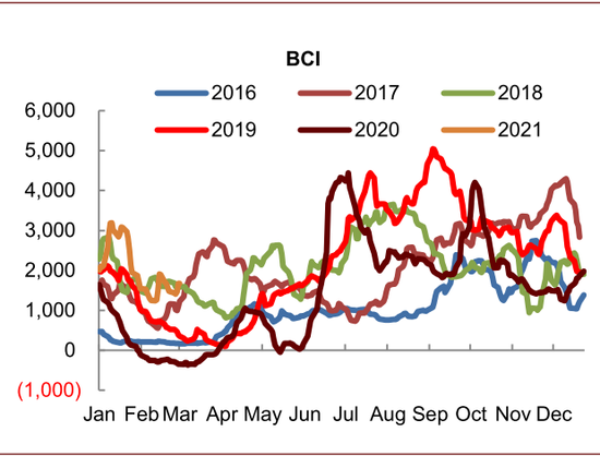 干散货:周期向上。在手订单与运力之比已经降低到只有6%的历史最低水平,每年的新船交付非常有限,随着需求复苏,我们认为有望开启盈利向上周期。从运价来看,年初以来小型船运价表现强势并且春节前后都没有明显回调,主要因船舶供给有限,需求受粮食和煤炭等货物支撑,大船(好望角型)主要受铁矿石需求影响,年初受铁矿石价格上涨带动运价冲高,近期出现明显的季节性回落。我们看好干散货市场供给端改善,节后复工有望驱动运价上涨。