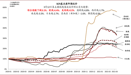 供给端,闲置船一直处于低位(仅占总运力的1%),春节期间运力停航远少于往年,但运价下跌的幅度好于预期。美线依然强势,3月12日SCFI美西线为3,999美元/FEU,周环比-0.2%,欧线和其他航线随着节后囤积货源的减少,运价有所回落, 3月12日SCFI欧线为3,712美元/TEU,周环比-6.4%,即使运价有所回落,各航线从最高点回落的幅度均仍不超过20%,好于预期。
