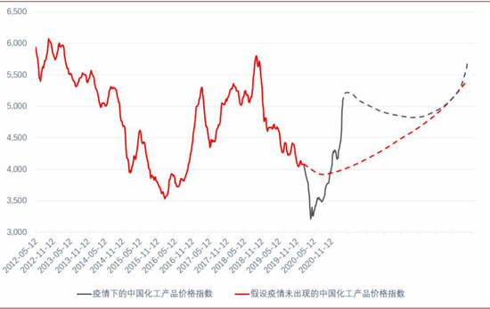 图表: 有疫情和无疫情下的中国化工品指数(示意图)