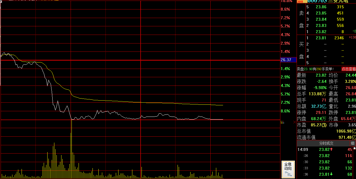 个股中,市值千亿级的白马股三安光电,上午盘中触及跌停。截至目前,其股价封住跌停,报23.81元,跌幅10.02%。公开资料显示,该股为半导体概念。