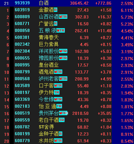值得注意的是,连日来大幅下跌的白酒板块全线反弹,金徽酒一度涨停,截至收盘,上涨6.11%。贵州茅台重回2000元上方,山西汾酒收涨5.73%,五粮液收涨4.54%。