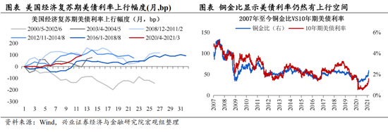 美债利率短期过快上行成为打破市场拥挤交易的催化剂,向后看或仍有40bp左右的上行空间。2000年以来,美国经济复苏利率上行约70-160bp,2020年4月以来美债利率已经上升了95bp,高点可能到1.8%至2.3%。从铜金比来看,美债收益率当前也有约40bp-60bp的上行空间。