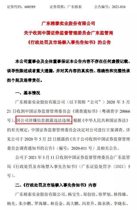 无独有偶,另一只今日涨停的个股——广东榕泰,也是同样刚刚被监管层出具了《行政处罚及市场禁入事先告知书》。