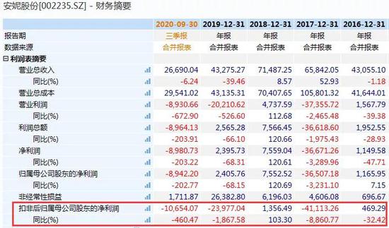 然而,除了被市场和监管部门质疑炒作外,安妮股份的业绩始终表现不佳。2019年年报显示,公司的扣非归母净利润亏损约2.4亿元,同比巨幅下滑;同时,2020年三季度合并报表显示,扣非归母净利润仍然同比大幅亏损1亿元。