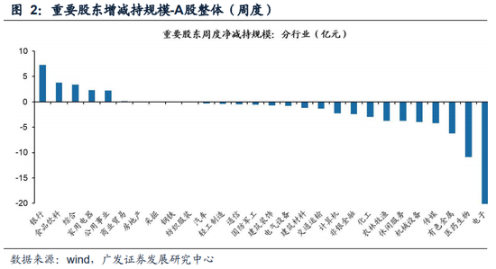 (2)重要股东增减持(A股整体): 本周重要股东减持53亿元,前一周净减持约76亿元。本周增持规模前三的行业为银行、食品饮料、综合,减持规模前五的行业为电子、医药生物、有色金属、传媒、机械设备。