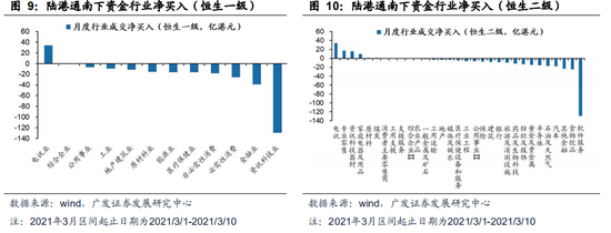 2021年3月(截止3月12日),南下资金净流出156亿元。净买入个股前五为中国移动、国美零售、小米集团-W、思摩尔国际、中信证券。恒生一级行业净买入前三名为电讯业、综合企业、公用事业,恒生二级行业净买入前三的行业为电讯、专业零售、资讯科技器材。