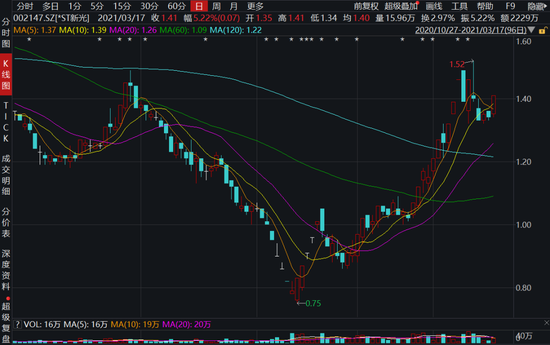 如,业绩持续亏损,2020年末巨亏30.75亿元的*ST新光,牛年以来股价上涨了25.23%,而《红周刊》记者观察发现,其股价的攀升早在2021年1月14日即开始启动,截至3月17日累计涨幅已接近70%,扭转此前曾连续9天股价跌破一元面值濒临退市的局面。