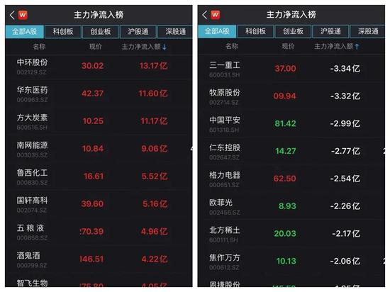 从主力资金流向看,中环股份、华东医药、方大炭素、南网能源等净流入额居前;三一重工、牧原股份、中国平安、仁东控股等净流出额居前。