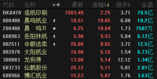 造纸板块今日大涨4.79%,创去年7月以来最大单日涨幅,今年以来累计上涨17.46%,远强于同期大盘走势。成交量急速放大,较前一交易日增加逾1倍。板块内绝大部分上涨,其中晨鸣纸业、岳阳林纸涨停,中顺洁柔、太阳纸业、龙利得等亦大涨超5%。
