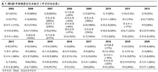 历史上每年涨幅居前行业都在变化。回顾2005-2020年申万行业年度涨跌幅情况,可以发现每年领涨行业都在变化。从历年各行业涨跌幅情况来看,从未出现过连续两年涨跌幅前三行业完全相同的情况,仅有白酒、银行、食品加工3个行业出现过连续2年位居行业涨跌幅前三,具体如下:05年白酒涨幅17%(当年涨幅排名第2,下同)、次年303%(第2);16年白酒涨幅29%(第1)、次年94%(第1);19年白酒涨幅102%(第1)、次年96%(第2);05年银行涨幅21%(第1)、次年174%(第3);10年食品加工涨幅38%(第2)、次年-17%(第3)。若将筛选标准进一步放宽至涨幅前五行业,涨幅前五且次年仍排名前五的行业虽稍有增加,但连续2年涨幅持续居前的行业数量仍非常少:分别为07年券商、08年电气设备、10年电子、12年房地产、13年家电、17年保险和家电等,具体情况见下表。每年涨幅排名前三的行业在次年仍能排进前三概率仅为6.7%,每年涨幅排名前五的行业在次年仍能排进前五概率为20%。综上所述,行业涨幅连续排名居前概率很低。