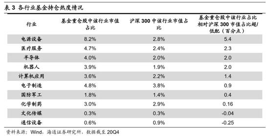 从机构持仓热度看,化学制药、通信设备等机构持仓热度较低。机构的持仓热度分析衡量股价表现是否已经隐含了基本面的好转或预期,我们以行业基金持仓市值占比/沪深300中该行业市值占比判断基金超配情况。成长类行业中,20Q4电源设备(包含光伏设备、锂电池等)、医疗服务、半导体、机器人的基金持仓热度偏高,相对沪深300超配均超过2个百分点。计算机应用(包含云计算、网络安全,以及大部分人工智能公司)、电子制造(包含消费电子)、国防军工、化学制药(包含创新药)、文化传媒(包含游戏)、通信设备基金持仓热度相对偏低,相对沪深300超配低于1.5个百分点。其中文化传媒和通信设备均相对沪深300低配,具体成长类行业基金持仓热度情况见下表。