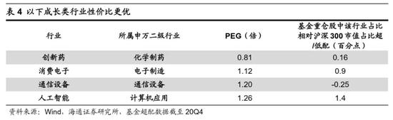 综合盈利估值匹配度和机构持仓热度,创新药、消费电子、通信设备、人工智能性价比相对更优。具体来看,创新药PEG为0.81倍、在以上所列成长类行业中盈利估值匹配度最优,且包含创新药的化学制药行业机构持仓热度较低,20Q4相对沪深300超配0.16个百分点。消费电子PEG低于1.5为1.12倍,所在的二级行业电子制造20Q4相对沪深300超配0.9个百分点,机构持仓并未明显超配。通信设备盈利估值匹配度和机构持仓热度较低,PEG为1.20倍、20Q4相对沪深300低配0.25个百分点。人工智能PEG为1.26倍,包含大部分人工智能公司的计算机应用行业20Q4相对沪深300超配1.4个百分点,机构持仓热度处于中等水平。