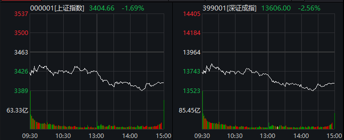 受多重因素影响,A股三大指数今日集体收跌,其中沪指下跌1.69%,收报3404.66点;深证成指下跌2.56%,收报13606.00点;创业板指下跌2.81%,收报2671.52点。