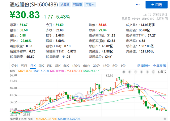通威股份创2020年12月10日以来新低,较2月10日的历史最高价回撤45%。