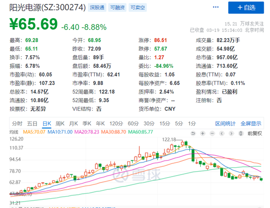 阳光电源创2020年12月29日以来新低,较2月10日的历史最高位回撤46%。