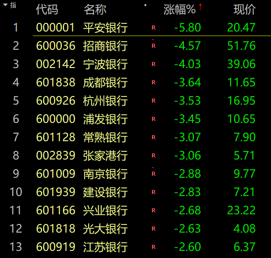 银行股全线走弱,平安银行跌近6%,招商银行、杭州银行、宁波银行、浦发银行跌超4%。