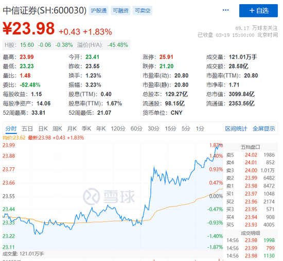 中信证券涨近2%。18日晚间,中信证券发布2020年年报。这份年报显示,截至去年年末,中信证券的总资产已经达到1.05万亿。
