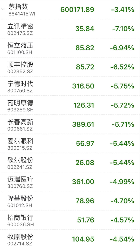 其中各个行业的千亿“茅”,立讯精密大跌7%,顺丰大跌6%、宁德时代大跌5.75%、药明康德大跌5.72%。