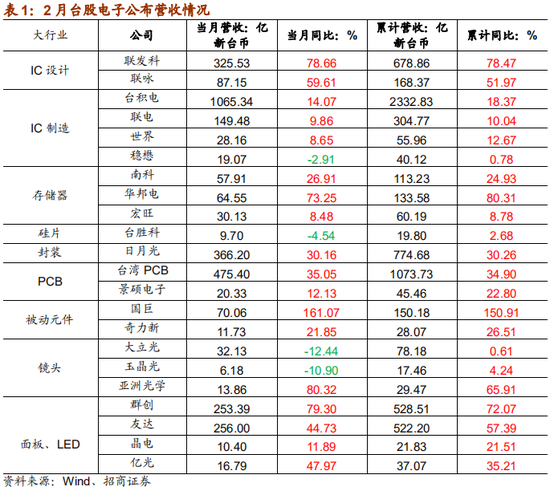 近日台股电子公布2月营收情况,IC设计、储存器、封装、PCB、被动元件、面板、LED等厂商营收均同比上行,硅片、部分IC制造和镜头同比下行。IC设计领域联发科2月份营收当月同比增长78.66%,增幅较1月增幅扩大0.37个百分点;联咏2月份营收当月同比增长59.61%,增幅较1月份扩大15.10个百分点;IC制造领域台积电、联电、世界、稳懋1月份营收当月同比分别增长14.07%、9.86%、8.65%和-2.91%,其中台积电增幅收窄8.18个百分点,联电增幅收窄0.35个百分点,世界和稳懋增幅分别收窄8.40和7.28个百分点;存储器厂商南科营收同比涨幅扩大2.59个百分点,华邦电同比涨幅收窄14.20个百分点,宏旺营收同比增幅收窄0.61个百分点至8.48%;硅片厂商台胜科和封装厂商日月光当月营收同比增幅均收窄;PCB厂商中台湾PCB和景硕电子营收分别增长35.05%和12.13%;被动原件厂商国巨2月份营收当月同比增长161.07%,奇力新2月份营收当月同比增长21.85%;镜头厂商大立光营收同比下跌12.44%,玉晶光当月营收同比增幅收窄25.85个百分点至-10.90%,亚洲光学营收同比上涨80.32%;面板、LED厂商中,群创、亿光营收同比增幅扩大,友达、晶电营收同比增幅收窄。