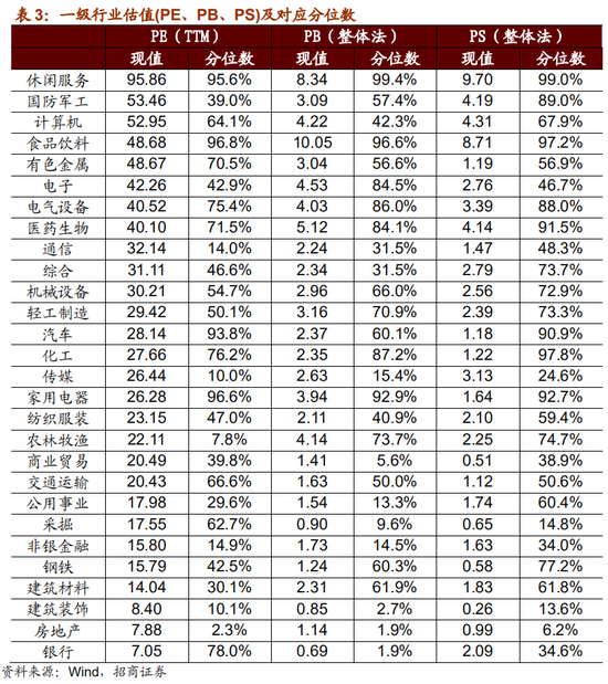 在行业估值方面,本周板块估值涨跌分化,其中,国防军工板块上涨明显,涨幅超1.5X,电子、有色金属、电气设备板块下跌明显,跌幅超1.0X。其中,国防军工板块估值上涨1.6X至53.5X,处于39.0%历史分位;电子板块估值下跌1.8X至42.3X,位于42.9%历史分位;有色金属板块估值下跌1.3X至48.7X,处于70.5%历史分位;电气设备板块估值下跌1.2X至40.5X,处于75.4%历史分位。截至3月19日收盘,一级行业估值排名前五的行业分别是休闲服务、国防军工、计算机、食品饮料、有色金属。