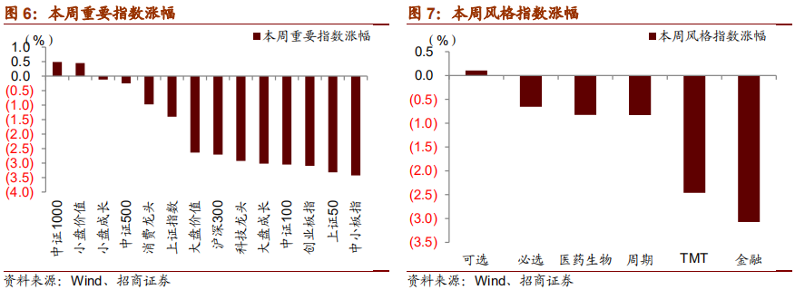 本周市场整体跌多涨少,部分板块具有结构性机会,上证指数、创业板指周内均呈现“倒N”型走势,中证1000、小盘价值指数上涨,大盘成长、中证100、创业板指、上证50、中小板指跌幅均超过3%,本周日均成交不足8000亿,较前几周继续缩量,南向资金本周净流入港股48.5亿,北向本周小幅净流入规模87.1亿,连续两周净买入,从大类板块上来看,本周除了可选消费板块小幅上涨外,其余各类风格本周均下跌。