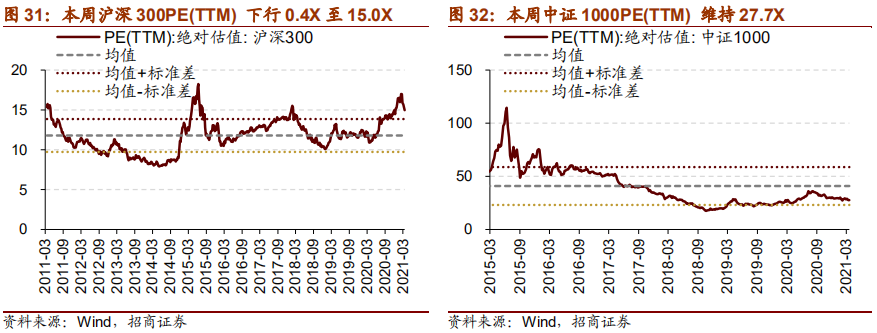 本周全部A股估值水平下行。截至3月19日收盘,全部A股PE(TTM)下行0.3X至18.4X,处于历史估值水平的74.1%分位数。创业板本周下行,PE(TTM)下行1.5X至47.8X,处于历史估值水平的47.8%分位数。代表大盘股的沪深300指数PE(TTM)下行0.4X至15.0X,处于历史估值水平的92.5%分位数。代表小盘股的中证1000指数PE(TTM)维持27.7X,处于2014年以来历史估值的28.4%分位数。