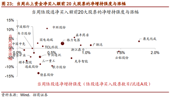 个股方面,北上资金净买入规模较高的为格力电器、三一重工、隆基股份等,其中格力电器净买入额近24亿元;净卖出规模较高的包括贵州茅台、泸州老窖、中国平安等。