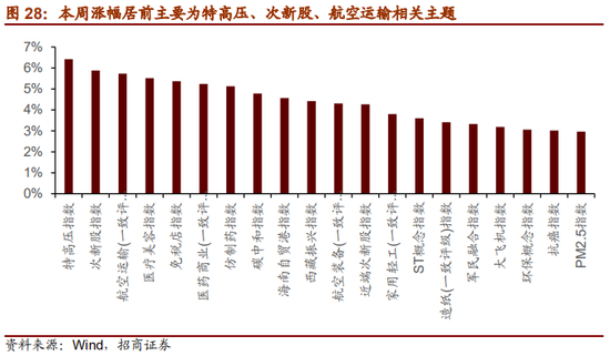 本周市场下跌,Wind全A指数周度下跌1.39%,创业板指跌3.09%,沪深300跌2.71%。本周涨幅居前的主要为特高压、次新股、航空运输相关主题。