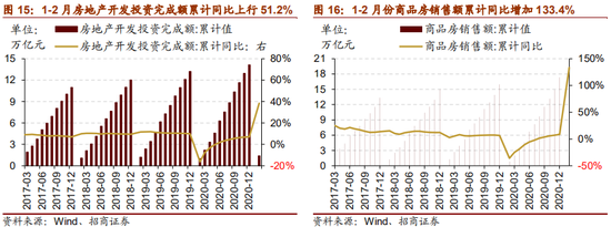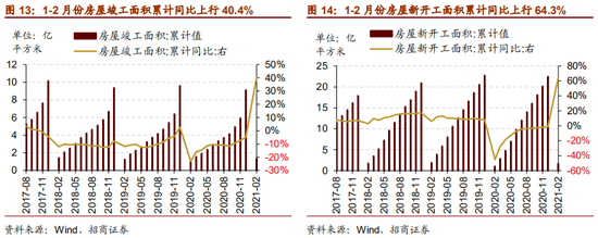 1-2月份房屋新开工面积、竣工面积累计同比均有大幅提升。2月份房地产开发占固定资产投资完成额的比重为30.92%;1-2月份房屋竣工面积累计值为1.35亿平方米,累计同比自2019年12月起首次转正,为40.40%;房屋新开工面积累计值为1.70亿平方米,累计同比为64.3%,较12月份增幅扩大65.5个百分点。