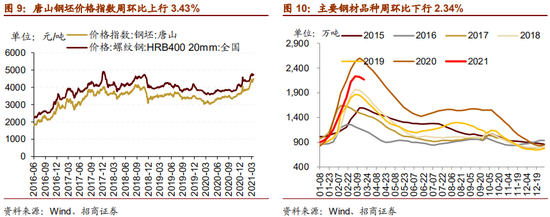 唐山钢坯价格指数上行,螺纹和铁矿石钢价格下降;铁矿石库存上行,钢坯和主要钢材品种库存下降。截至3月18日,唐山钢坯价格指数周环比上行3.43%至4490元/吨;截至3月19日,螺纹钢价格周环比下行0.25%至4729元/吨;铁矿石价格指数周环比下行2.4%至586.98点。库存方面,截至3月18日,港口铁矿石库存周环比上行1.08%至13023万吨;唐山钢坯库存周环比下降7.3%至69.2万吨;截至3月19日,主要钢材品种周环比下行2.34%至2167.72万吨。