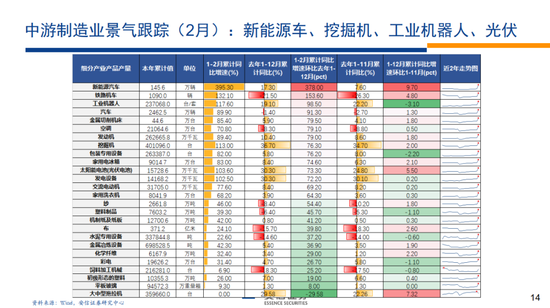 中游制造景气:2月新能源车、工业机器人、挖掘机、光伏电池产量同比增长靠前。