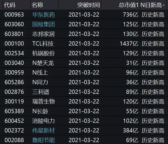 今日股价创新高的个股还包括华东医药、国检集团、志邦家居、杭锅股份等。从市值分布看,多数个股总市值低于500亿元,不少个股属于总市值不足100亿元的市场小票。