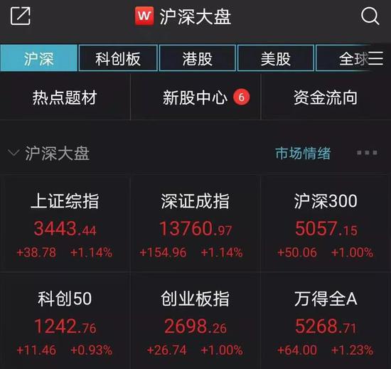3月22日A股三大指数开盘后冲高回落,此后再度拉涨。Wind数据显示,截至收盘,上证指数涨1.14%,报3443.44点;深证成指涨1.14%,报13760.97点;创业板指涨1%,报2698.26点。