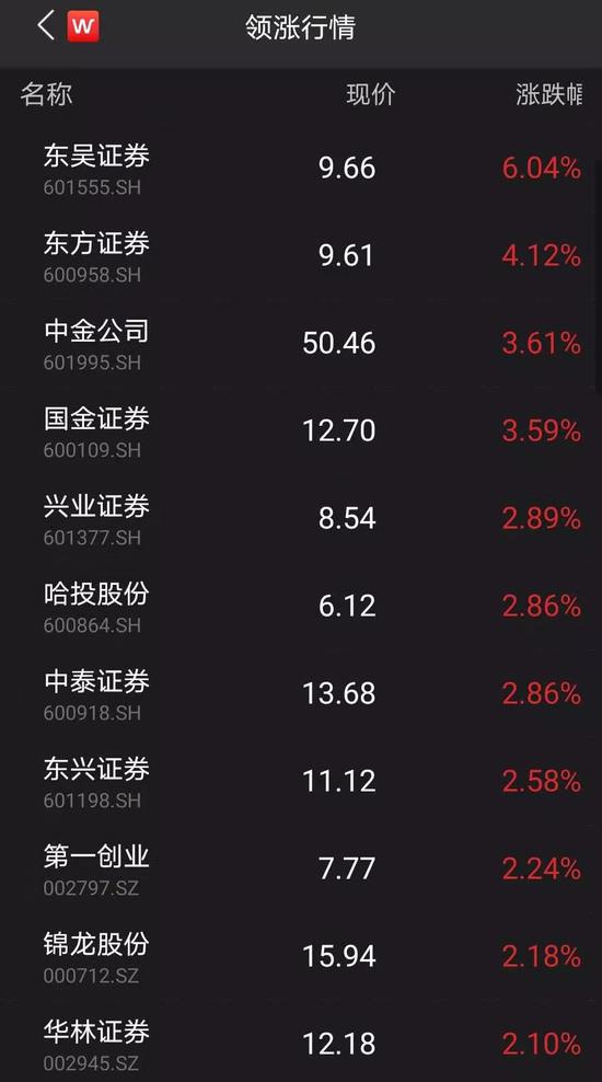 东吴证券大涨6.04%,东方证券、中金公司、国金证券收涨逾3%,兴业证券、中泰证券、东兴证券等11只成分股收涨逾2%。