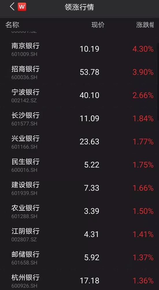 南京银行跟涨4.3%,截至收盘报10.19元/股,已接近此前的历史新高10.38元/股;招商银行截至收盘涨3.90%,其A股总市值突破1.35万亿元;宁波银行、长沙银行、兴业银行、民生银行、建设银行等11只个股涨逾1%。