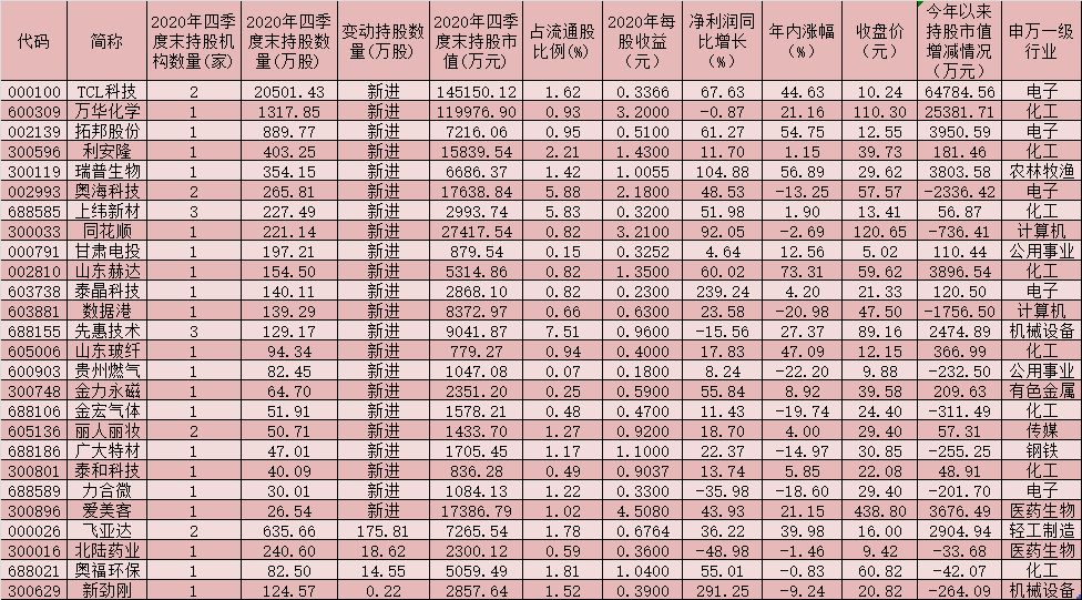表:已披露2020年年报且去年四季度被QFII新进增持的个股一览