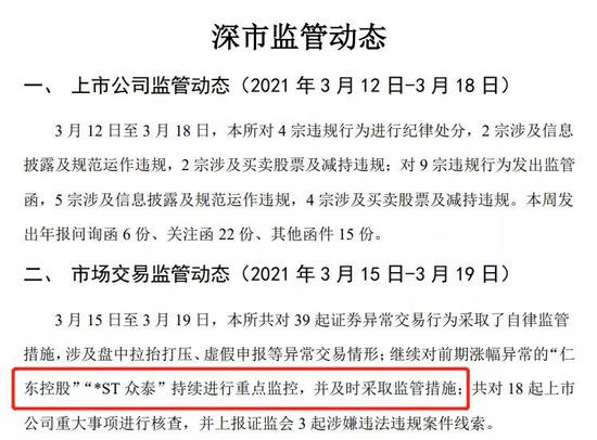 3月19日,深交所官网发布监管动态,表示将继续对前期涨幅异常的仁东控股、*ST众泰持续进行重点监控,并及时采取监管措施。