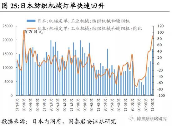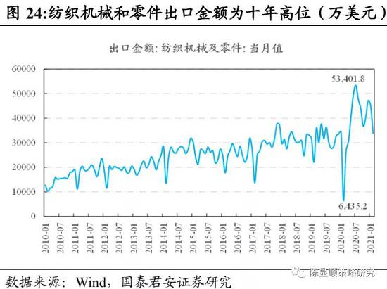 我国纺织机械出口金额处在近年来最高水平。受疫情冲击,2020年2月中国纺织机械和零件出口金额断崖式下跌至6435.2万美元,但随后一路反弹至2020年7月高点53401.8万美元,随后维持高位水平,为近十年来最高水平。日本纺织机械订单快速回升。2020年上半年受疫情冲击,全球纺织机械订单大幅下滑,10月日本纺织机械订单增长34.9%,同比回正,之后增速持续加快,考虑2020年四季度基数并不低,订单增速加快表明下游资本开支回升。