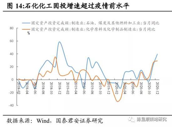 石化化工固投增速超过疫情前水平,炼油、化工盈利大幅改善。受疫情影响,2020年石化化工项目投资启动时间较晚,很多大项目Q3才陆续进入招标和开工,带动固投上行,2020年石化、化工固投增速分别为9.4%和-1.2%,且均在四季度增速提速,12月增速分别达到39.8%和29.1%,超过2019年疫情前水平。根据国君石化团队观点,对炼油企业而言,油价低位启动时期往往炼厂盈利较好,一方面原油及化工品库存随原油价格上涨而产生库存收益,另一方面低位原油价格使得裂解价差处于较高水平。我们对中信石化化工(一级行业)统计发现,20Q1以来炼油、化工企业净利率逐季抬升,20Q3净利率分别为8.8%、7.5%,均已达到2019年以来季度新高。