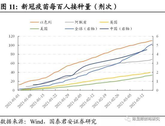 海内外居民存款高增、疫苗加速接种,为疫后可选消费复苏提供支撑。疫情期间海内外居民存款高增,以中美为例,2020年中国住户存款增加11.31万亿,而2019年增加额仅为6.72万亿。2020年美国个人储蓄存款增加11.3万亿美元,增加额创1930年以来新高,是次高值(2012年/257万亿美元)的4.4倍。全球新冠疫苗接种进度超市场预期,截止2021年3月17日,美国每百人新冠疫苗接种量达到33.8剂。