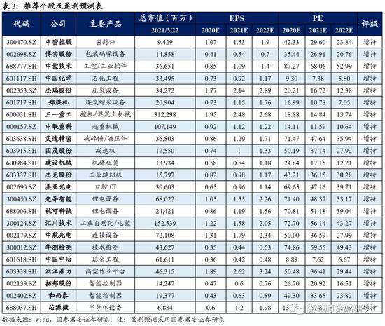 ? 赛道和个股推荐:1)石化化工设备。推荐:中密控股/博实股份/中控技术/中国化学。2)油气开采设备。推荐:杰瑞股份。3)采矿设备。推荐:郑煤机/三一重工/中联重科/艾迪精密/国茂股份/建设机械。4)砂石骨料、废钢加工设备。受益标的:浙矿股份/华宏科技。5)消费品和服务制造设备。推荐:杰克股份/美亚光电;受益标的:弘亚数控。6)新能源汽车电池、电控设备。推荐:先导智能/杭可科技/汇川技术。7)航空航天领域设备。推荐:中航光电。8)其他周期领域设备。推荐:华测检测/中国中冶/浙江鼎力;受益标的:柏楚电子。9)其他消费领域设备。推荐:拓邦股份/和而泰/芯源微;受益标的:信捷电气/捷昌驱动/伊之密。