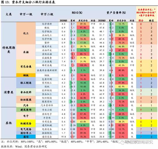 第三,我们进一步从ROIC、资产负债率角度考量,除了上述行业之外,我们也看到一些其他行业如建材(光伏玻璃)、建筑装饰(专业工程)、电子(半导体)、国防军工(航空装备、船舶制造、通信(通信设备)也具备较强的资本开支动能。