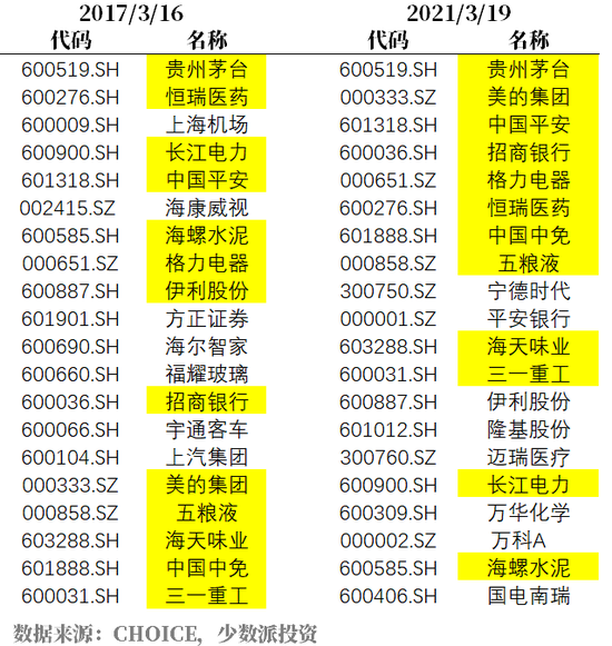 先观察数据,上述表格记录的是CHOICE记录到的北上资金有记录以来的首日(2017年3月16日)前20名按持有市值排序的配置名单与截止到2021年3月19日前20名按持有市值排序的配置名单,历时差不多四年。